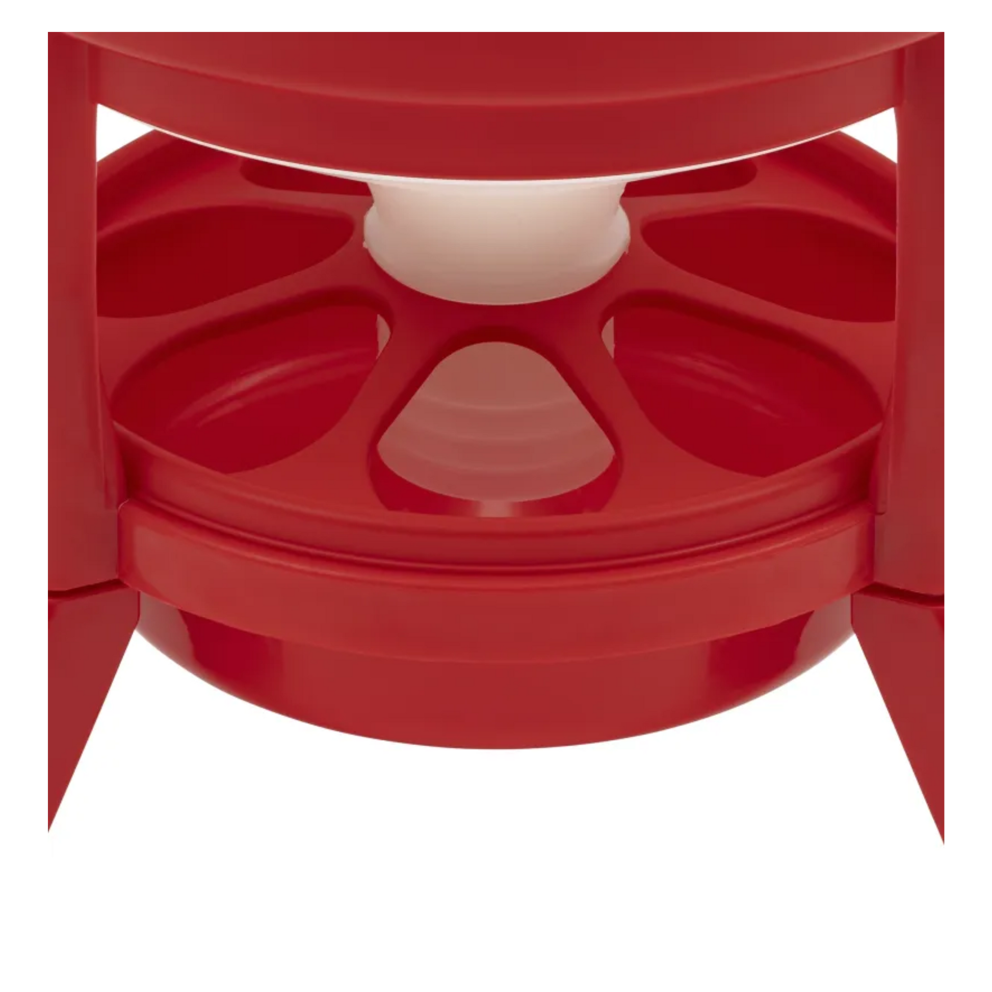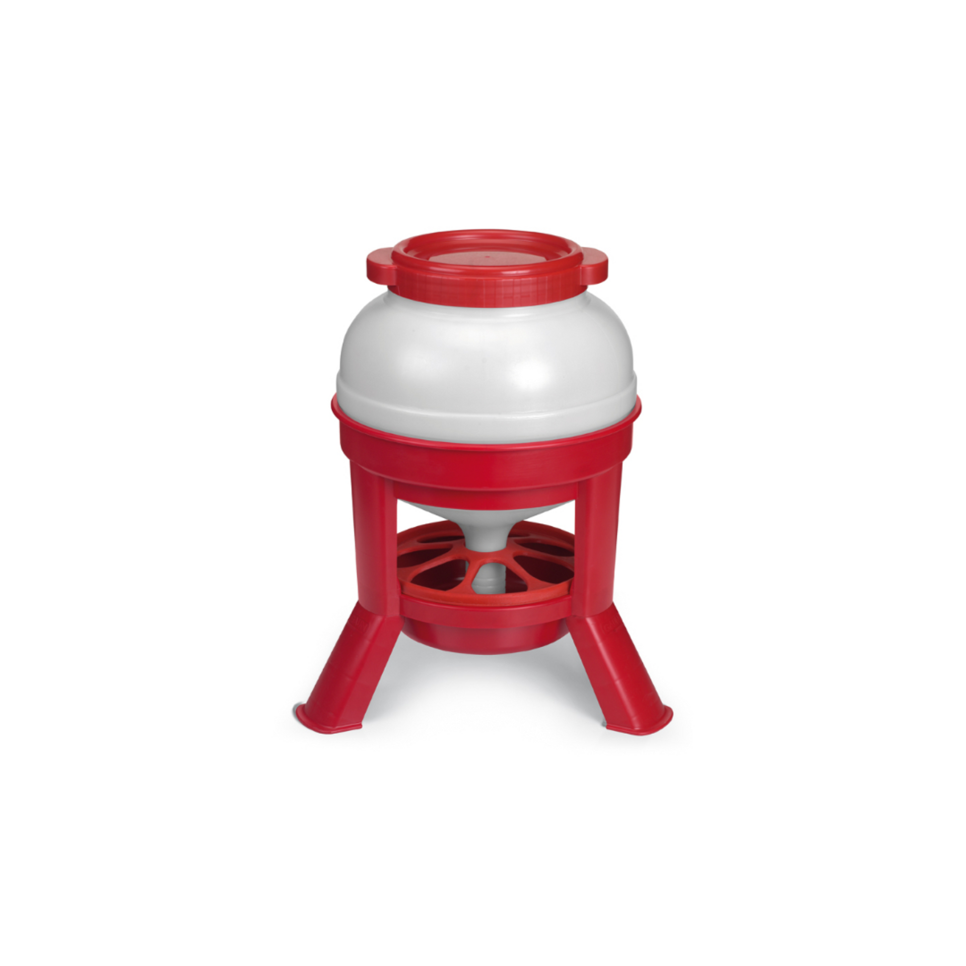 Solid fôrautomat for høns og annet fjærfe med kapasitet på 20 kg – ideell for både inne- og utebruk. Den opphøyde fôrsålen (16 cm over bakken) beskytter fôret mot forurensning fra jord, strø og når hønene sparker rundt.