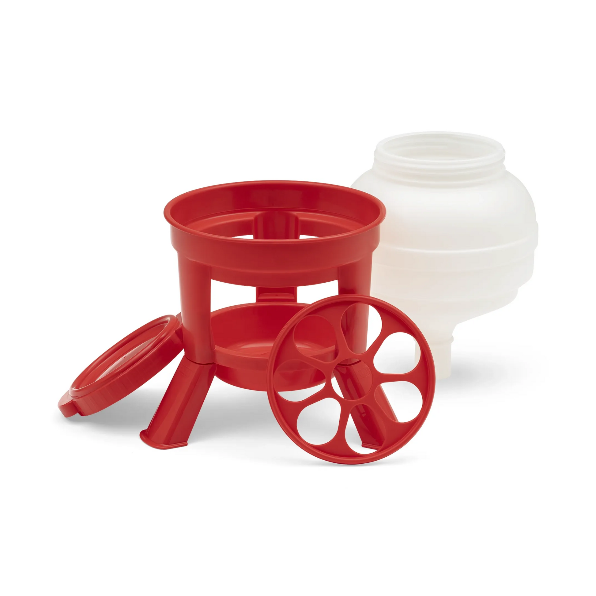 Fôrautomaten har 7 spiseplasser som bidrar til at fuglene spiser roligere og reduserer søl. Beskyttelsesringen kan enkelt tas av ved behov. Fôrets utløpsmengde kan justeres slik at dine høns alltid får riktig mengde fôr, uten unødvendig svinn.