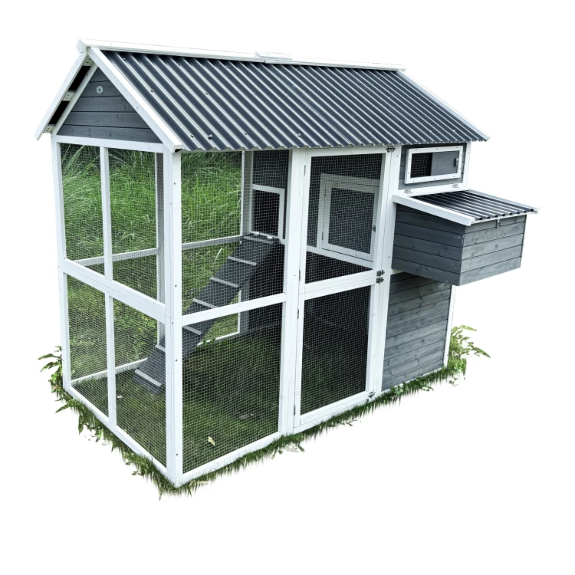 Med målene 195 × 140 × 180 cm får du et romslig hønsehus kombinert med en stor inngjerdet luftegård i galvanisert netting. Her kan hønene bevege seg fritt, samtidig som de er beskyttet.
