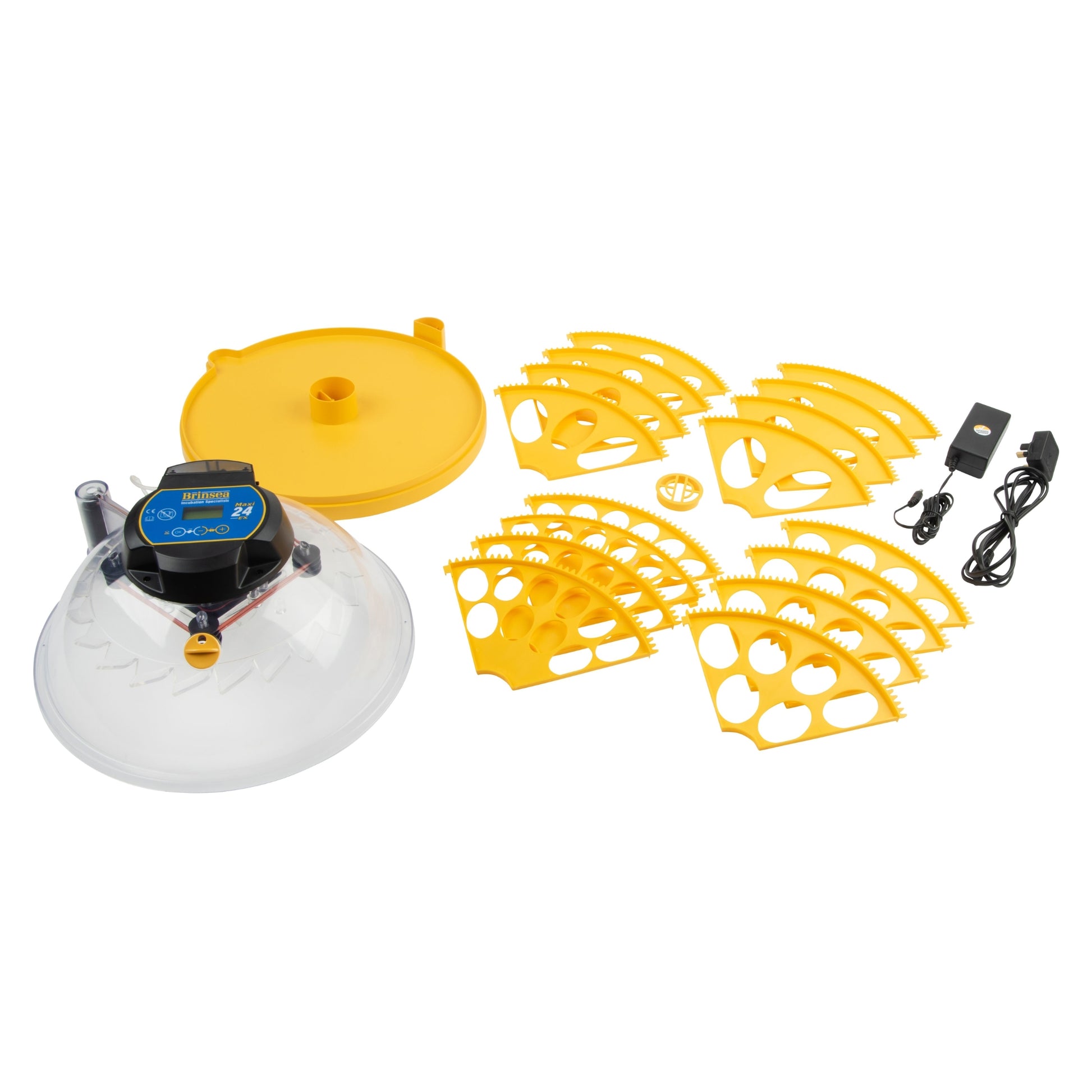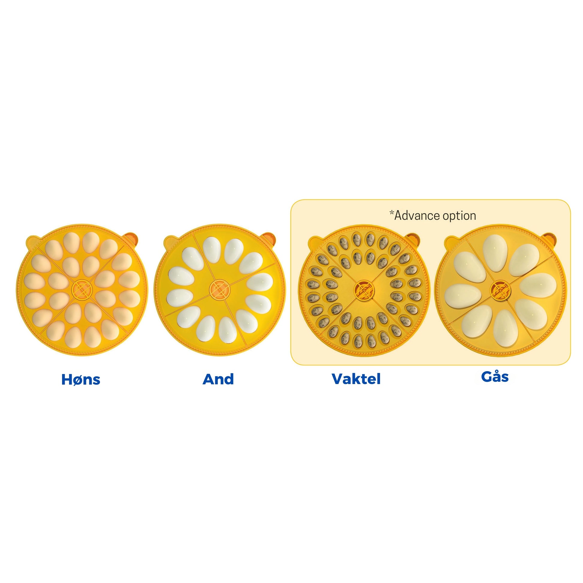 Maxi 24 EX har plass til opptil 24 hønseegg, takket være Brinsea sitt innovative eggdisk-system med kvadranter. Kvadrantene klikkes enkelt sammen, slik at du kan ruge egg av én størrelse eller kombinere egg av forskjellige størrelser samtidig. Maskinen leveres med kvadranter for vaktel-, høns-, and- og gåseegg som standard.