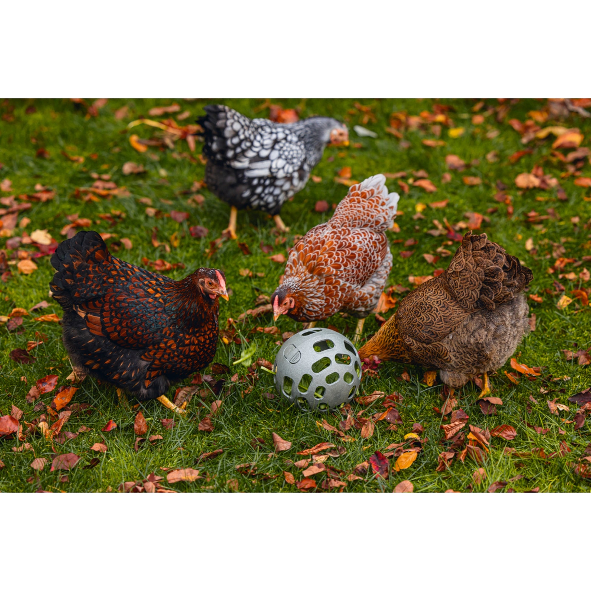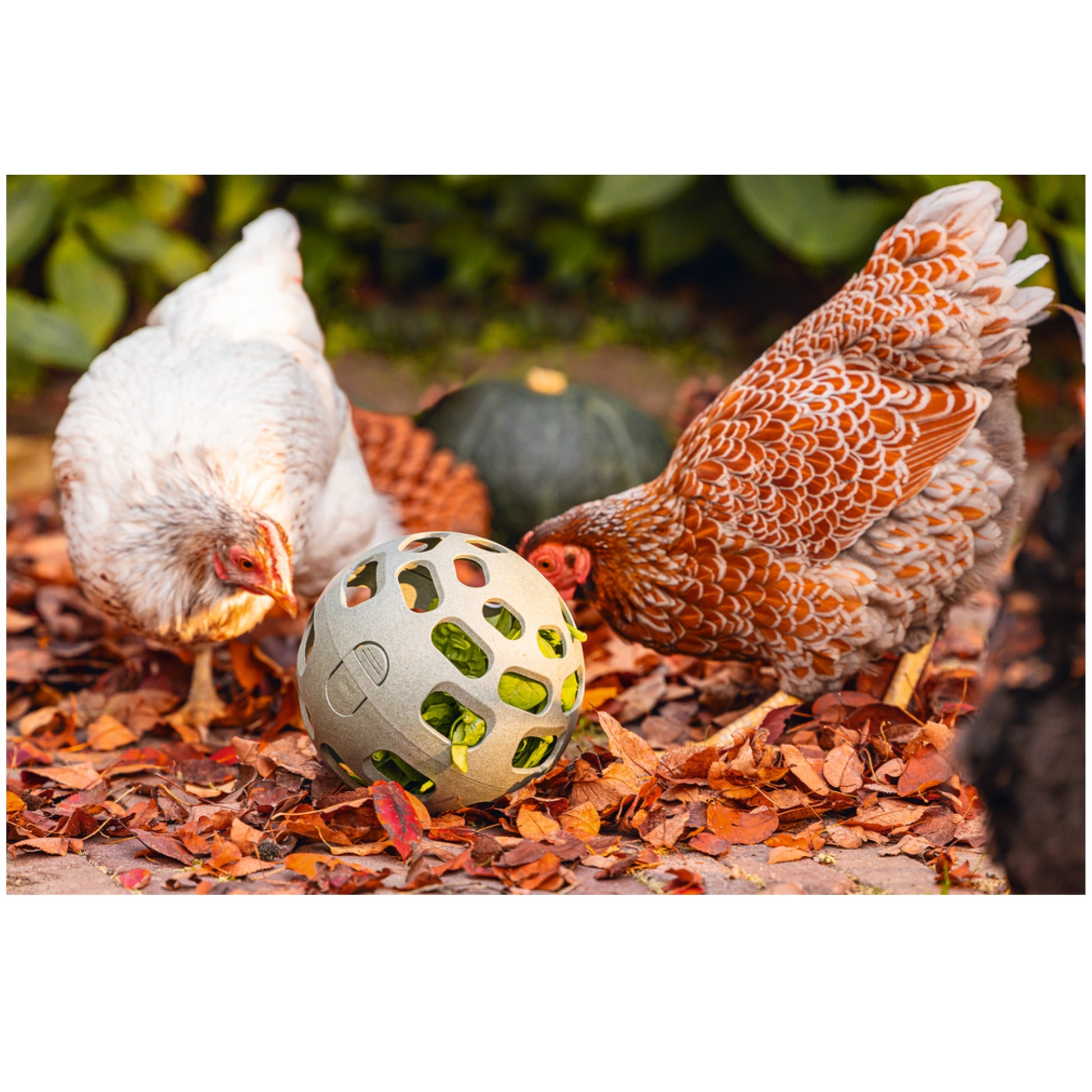 Snackballen lar deg fylle den med fôr som hønene kan plukke ut ved hjelp av nebbet. Når ballen rulles på bakken, stimuleres fjærfeet til naturlig søkeatferd. Dette bidrar til en mer variert diett, reduserer kjedsomhet og fremmer mer aktive og fornøyde fugler.