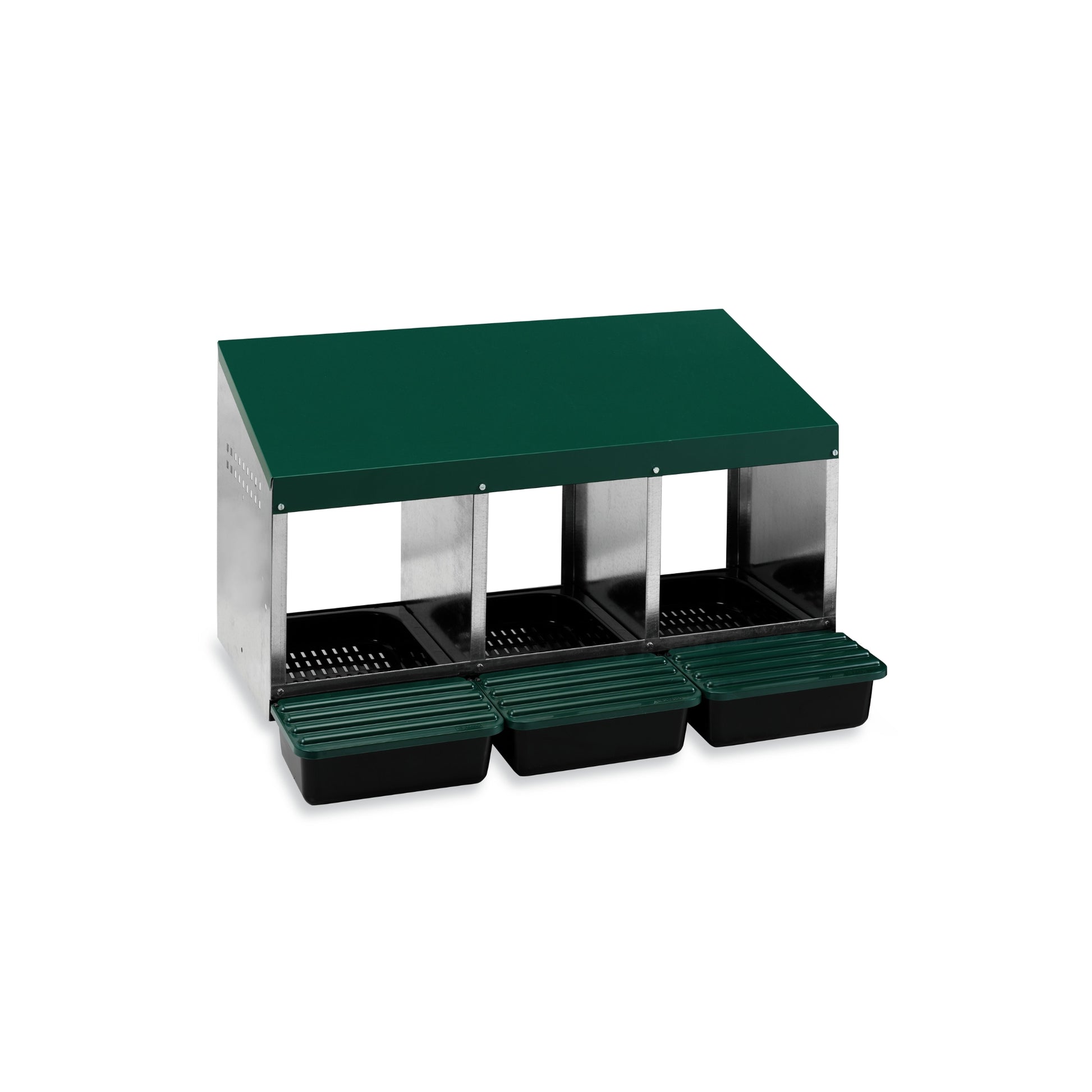 Verpekassen er laget av galvanisert stål og slitesterk plast, noe som gjør den lett, robust og enkel å montere. Det hygieniske redeområdet er lett å rengjøre og gir fuglene dine en fredelig og skjermet plass for egglegging. Det skrånende taket hindrer fuglene i å sitte oppå kassen, noe som bidrar til å opprettholde renslighet og orden i hønsehuset.